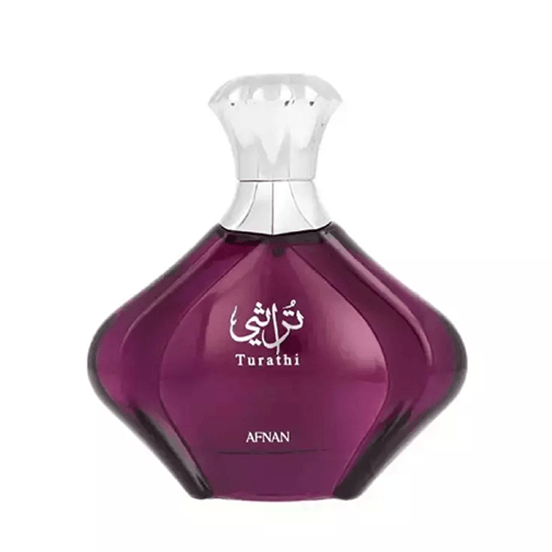 Turathi Purple de Afnan es una fragancia de la familia olfativa Aromática Especiada. Las Notas de Salida son Frutas rojas, cardamomo y pimienta negra; las Notas de Corazón son jazmín y piña; las Notas de Fondo son pachulí, vainilla y musgo.